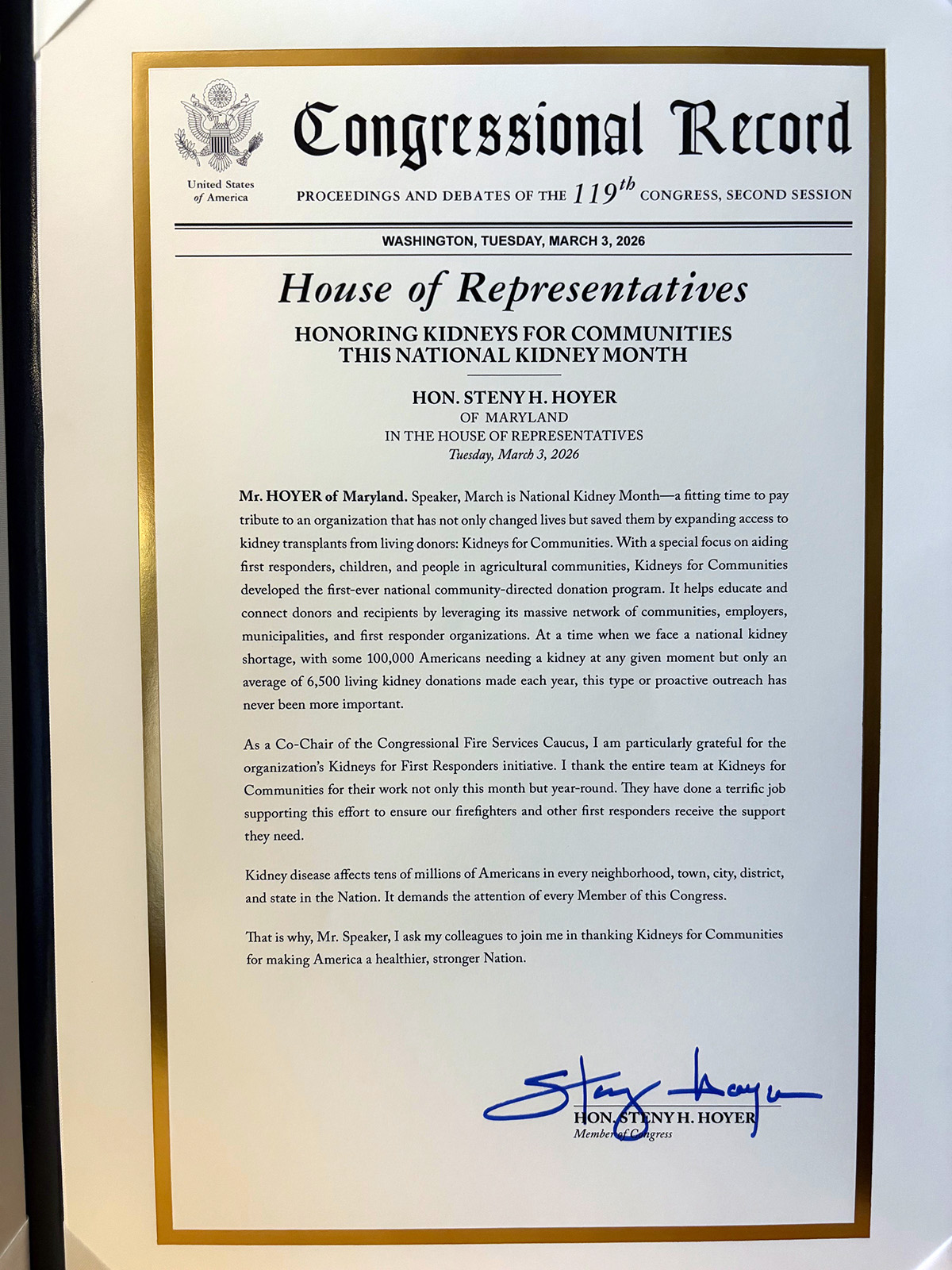 Kidneys for Communities has received Congressional recognition from Steny H. Hoyer